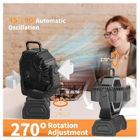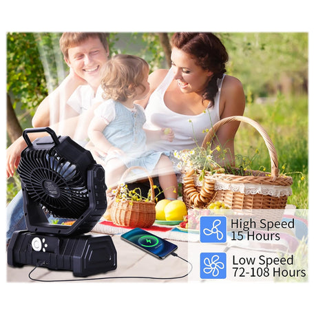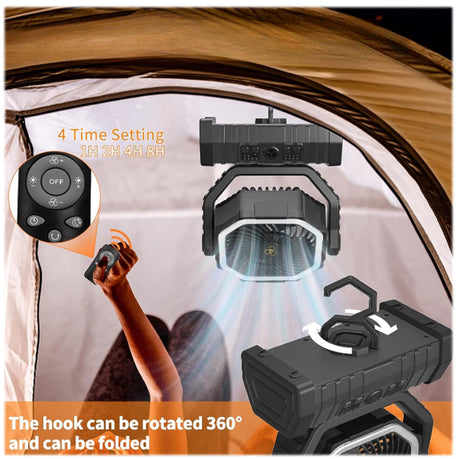 Featuring a 360 rotating and foldable hook, this tent fan can be effortlessly hung wherever you need airflow, from inside a tent to a tree branch, ensuring optimal cooling in any setting.