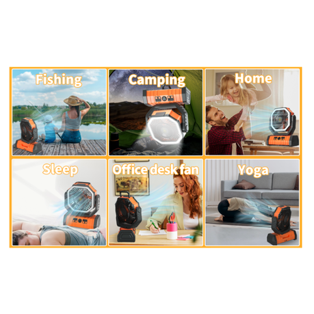 The F6 Outdoor Fan is more than just a fan; it's an all-encompassing solution for your outdoor cooling needs. Whether you're camping under the stars, enjoying a backyard barbecue, or facing a hot day at the beach, this fan provides not only a powerful breeze but also lighting, a phone stand, and even emergency charging for your devices. Stay cool, comfortable, and connected with the F6 - your ultimate outdoor companion.